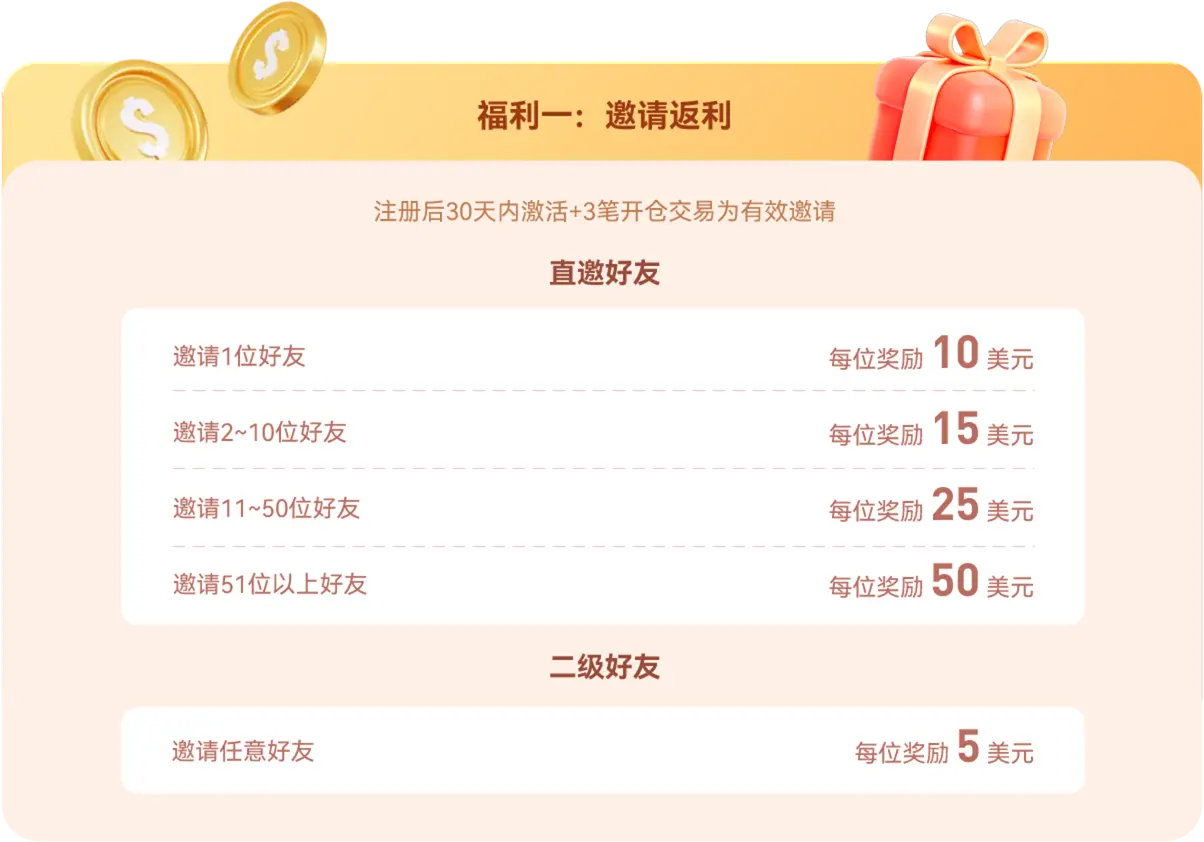 (2)邀请奖励需在邀请好友注册后30天内激活+完成3笔开仓,方可领取对应奖励。奖励按您直接邀请总人数进行累加,邀请人数越多,您每邀请1人得到的邀请奖励也就越高